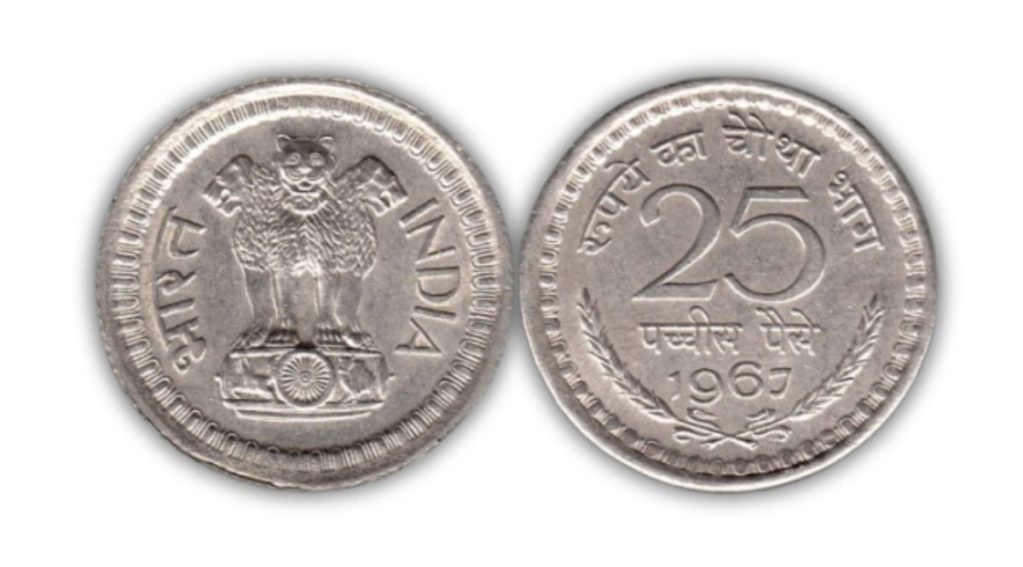 The first coin on our list is the 25 paise coin from 1967. These coins were issued from the Bombay and Calcutta mints, but the Bombay mint coin is the valuable one. If you had collected this Bombay mint coin 4-5 years ago, its value would have been around ₹500. Today, its value has increased significantly, ranging from ₹500 to ₹1,500. In just a few years, its value has tripled. To identify the Bombay mint coin, look for the diamond mint mark under the date.
