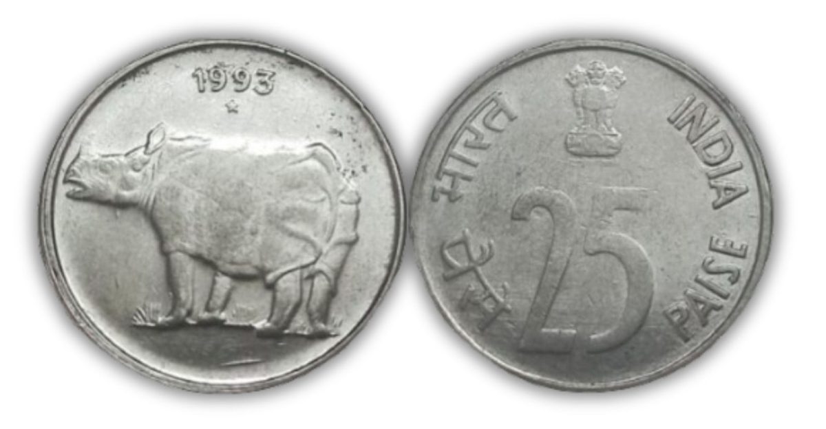 Finally, we have the 1993 25 paise “genda” (rhino) coin. This coin is quite famous and commonly found. You need to look for the 1993 Hyderabad mint coin among these rhino coins. These coins were minted in Bombay, Calcutta, Hyderabad, and Noida, but only the Hyderabad mint coin is valuable. Its price ranges from ₹10,000 to ₹35,000.