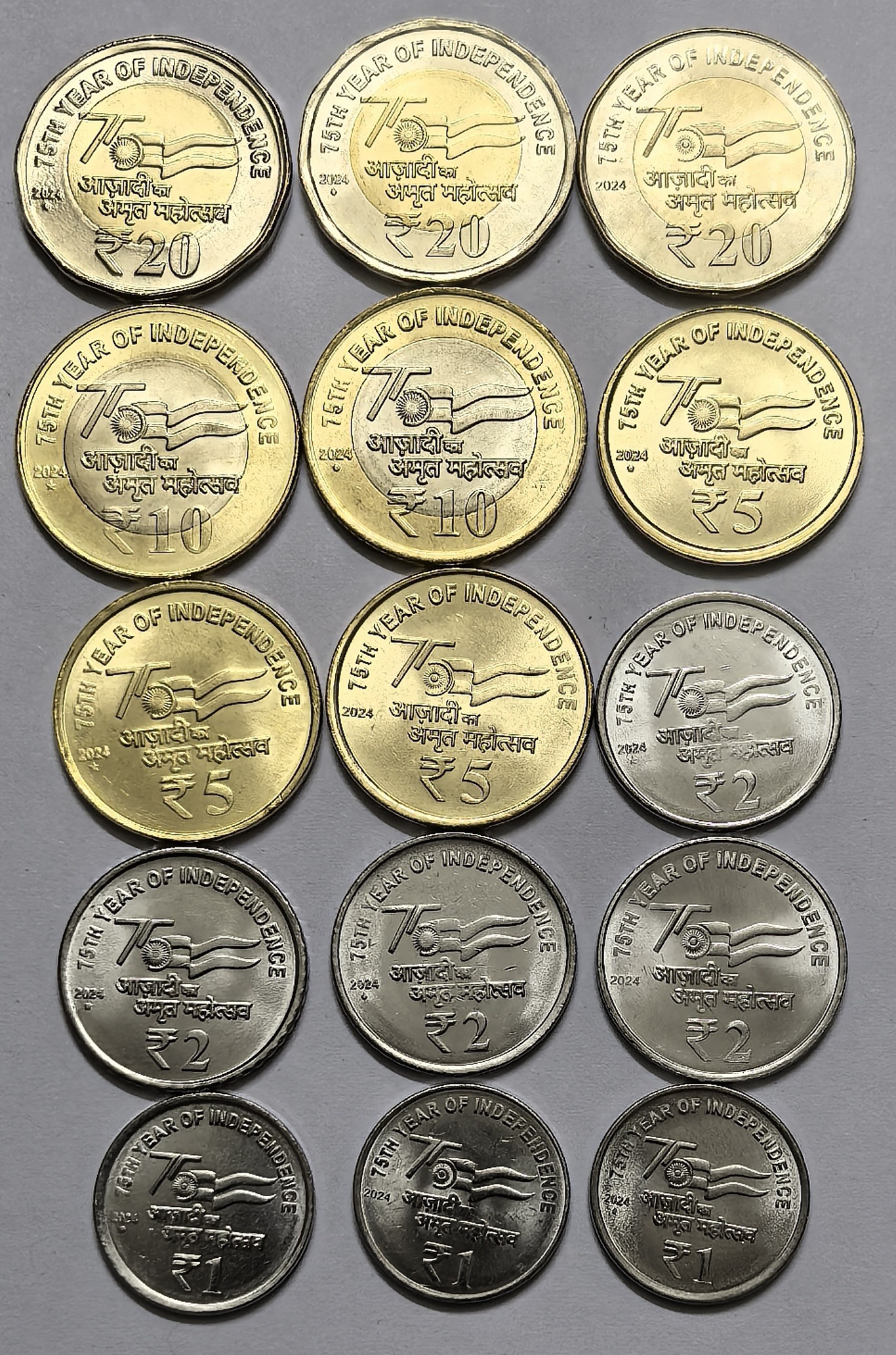 Step into the world of numismatics with the AKAM 2024 15 Coins Set UNC from different mints. This unique set comprises 15 uncirculated coins of various denominations, including 1 RS, 2 RS, 5 RS, 10 RS, and 20 RS, minted in Noida, Mumbai, Kolkata, and Hyderabad. Each coin is in pristine condition, untouched by circulation, making them highly sought after by collectors and enthusiasts alike.