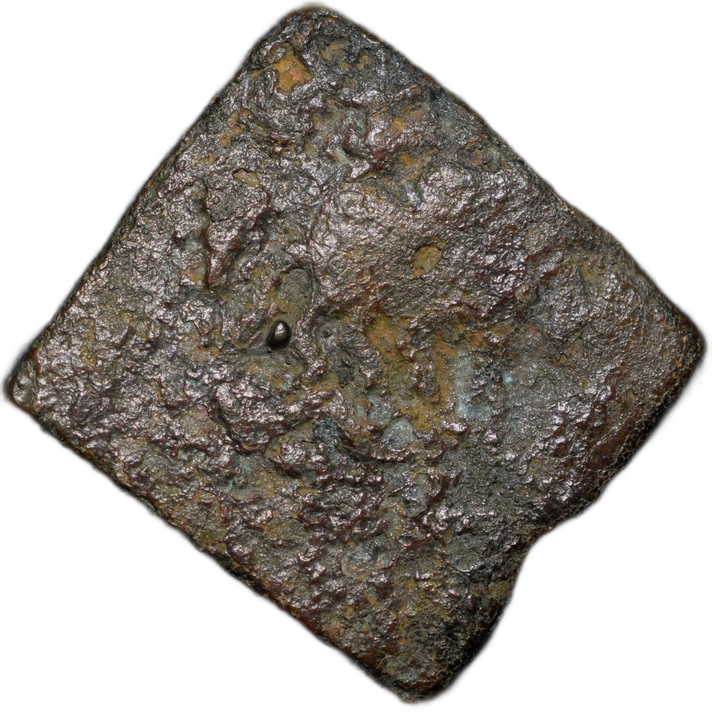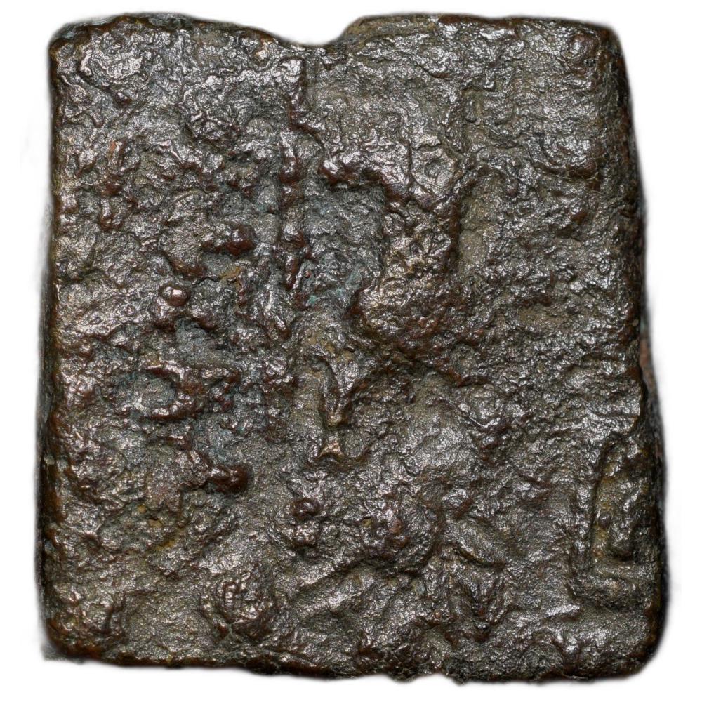 Bhadra/Mitra Dynasty, Surya Mitra, (2nd Cen. BC), Copper Unit, Obv: Armed wheel above bull walking right, Triangular headed symbol behind, Rev: Lord Shiva Kind of Figure with dand in left hand standing above lotus flower, Brahi legends in the left field ‘Suyamitasa’, 4.06 Gms, 8.71 x 7.34 mm, About Fine, Rare.
