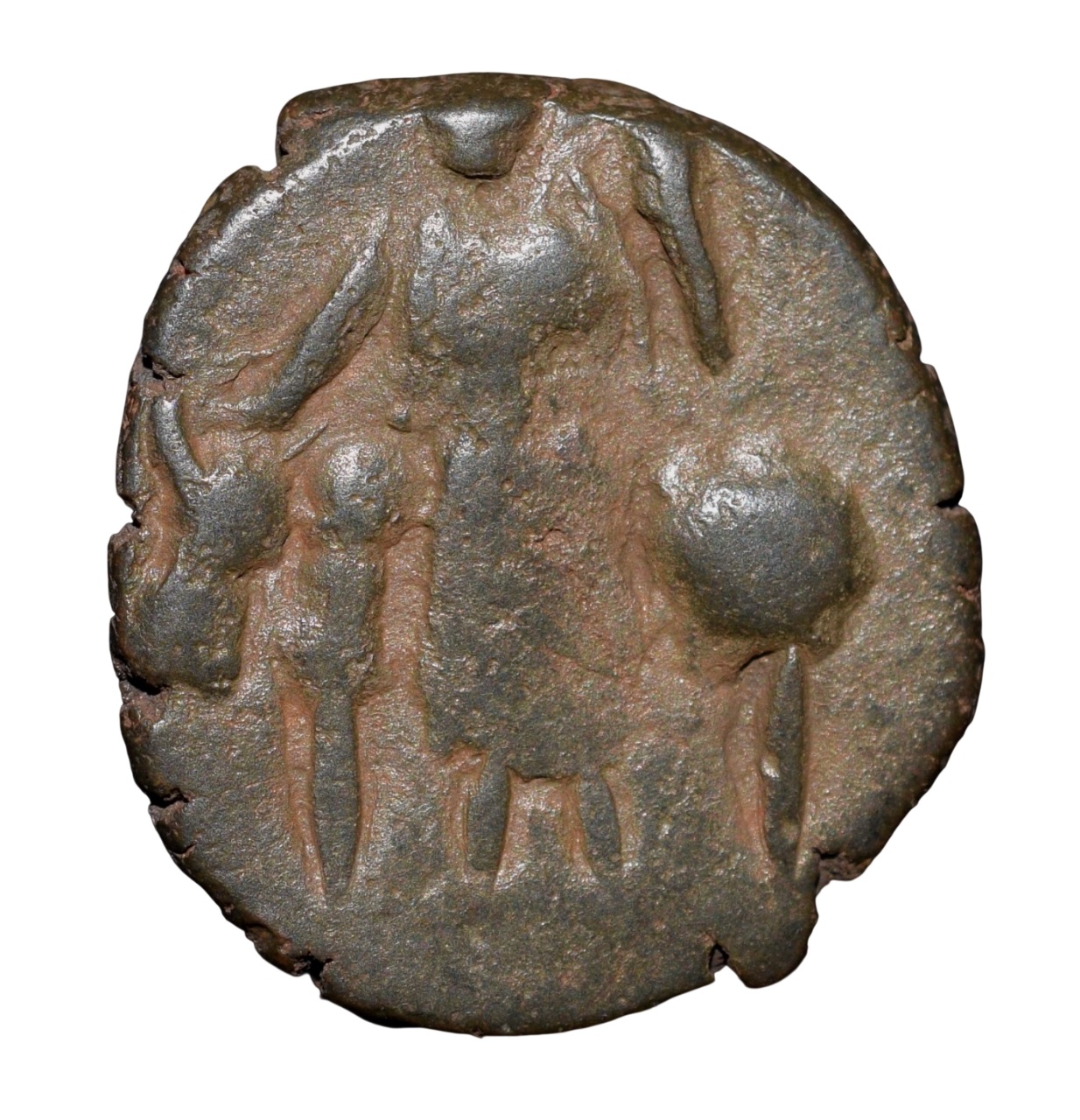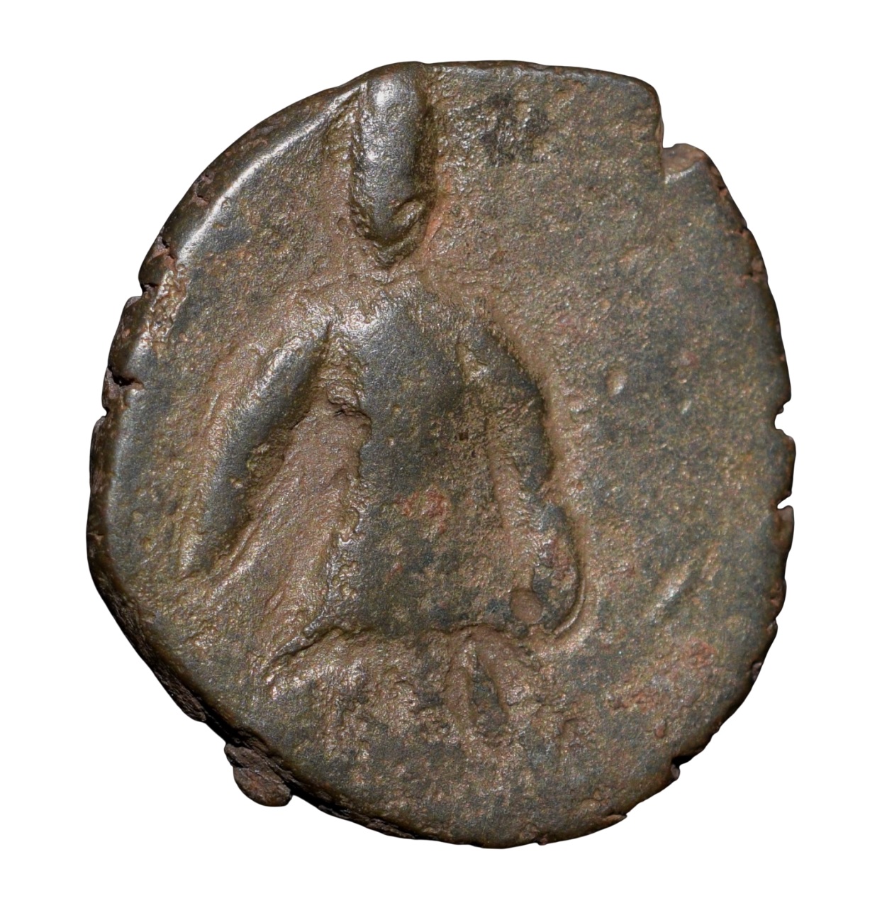 Kushan Dynasty, King Vasudev (AD 190-230), Copper Unit, Taxila Series, Obv: King standing facing holding Trident in left hand, and right hand lowered to an alter, Rev: Shiva standing besides the bull(Nandi), 2.86 Gms, Extremely Fine, Rare Fractional denomination in Beautiful Grade.