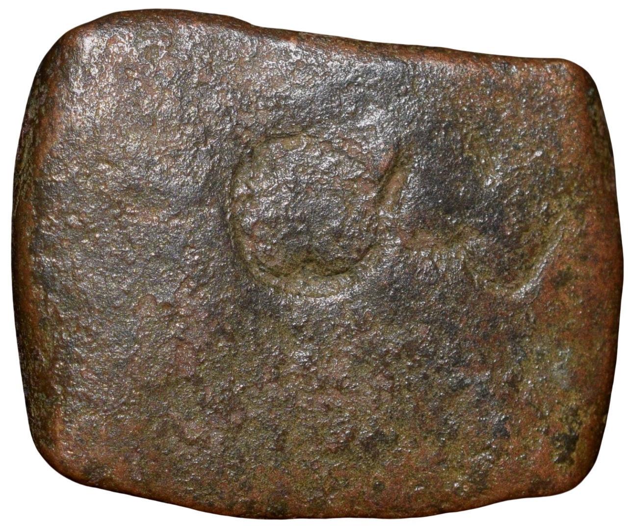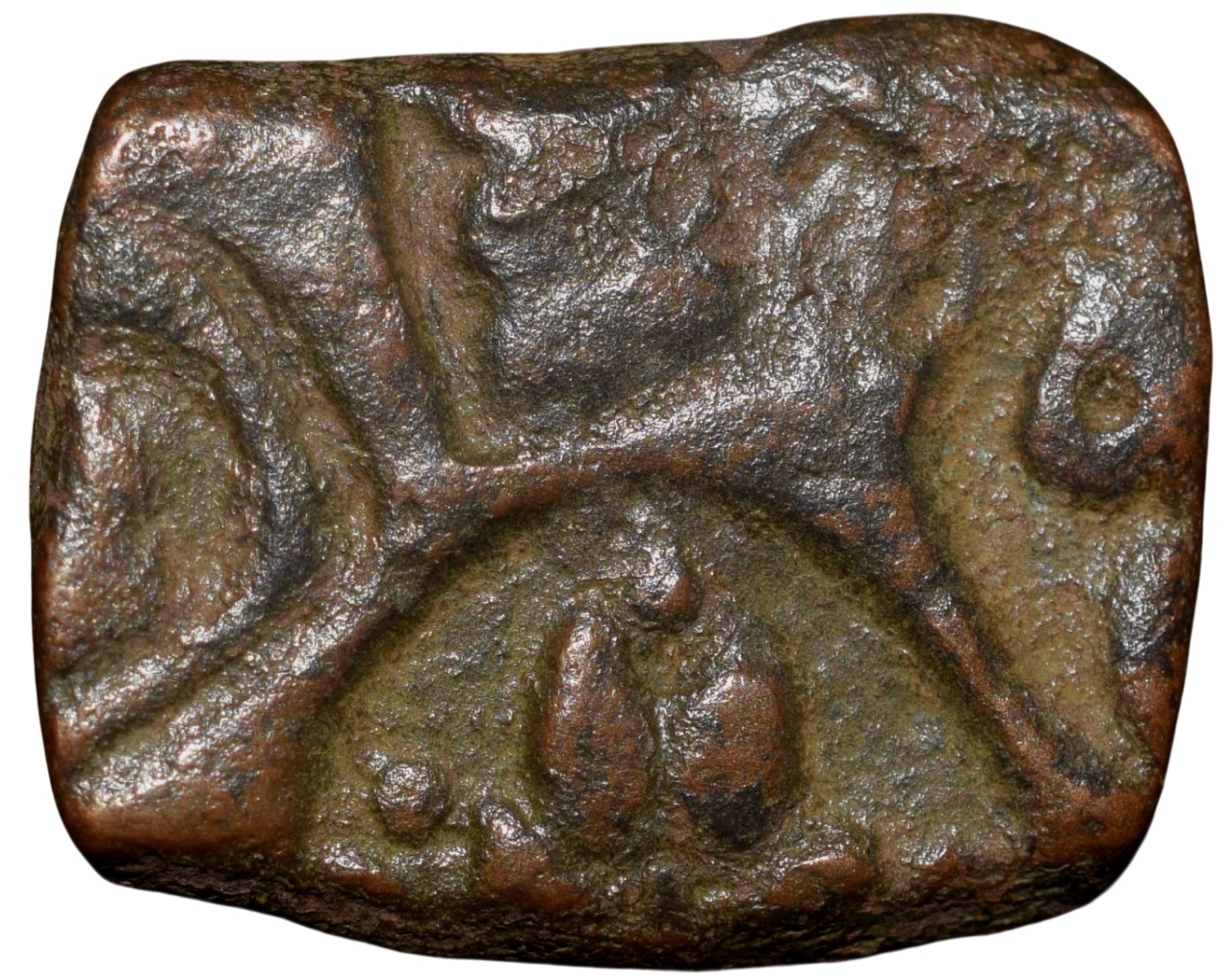 Vidarbha Region (3rd – 2nd Cen. BC), Copper Punch-Marked Unit, with punches showing sun, sixarched symbol, tree railing, indradvaja and swastik, 2.30 Gms, (Guptas & Hardaker, # 583), Extremely fine.