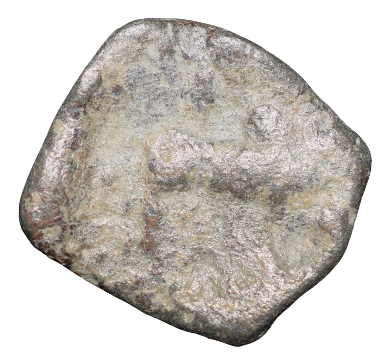 Lead Coin of Rudrasen III? of Western Kshatrapa(300-400 AD) Bull facing Right/3-Arched Hill