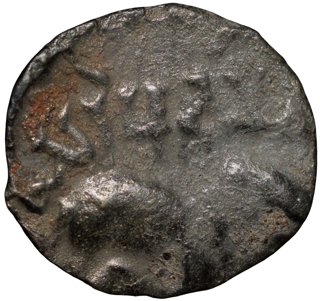 Satavahana Dynasty, Siva Siri Pulumavis (1st Cen. BC), Potin Unit, Obv: elephant facing right and bramhi legends top ‘(Si) VaSiripudumavi(sa)’, Rev: Ujjaini symbol, 2.26 Gms, Very Fine, Rare with complete legends.