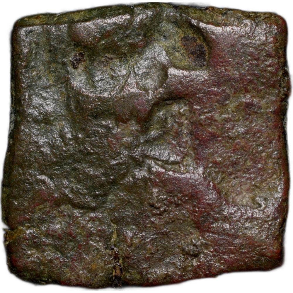 Eran-Vidisha (2nd – 1st Cen. BC), Copper Punch-Mark Unit, Obv: Elephant, Triangular headed in railing, River below with fishes, Rev: Lotus flower counter-struck, 3.20 Gms, 16.61 X 16.79 mm, About Very Fine, Rare being counter-struck with lotus flower on Rev.
