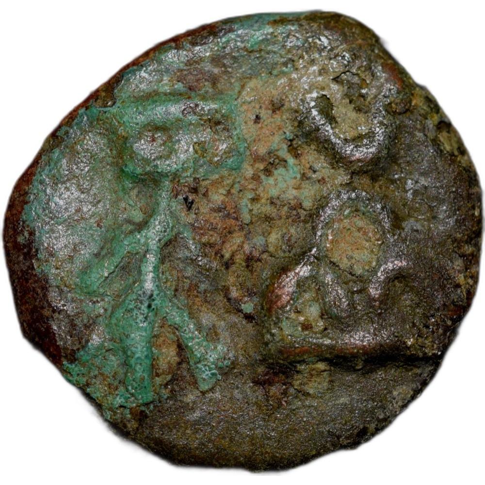 Mauryan Empire, Vidarbha Region, (300-200 BC), Mauryan Cast Copper Unit, Obv: three arched hill and tree in railing, Rev: uniface, 3.46 Gms, 16.13 mm, (W. Pieper # 525), In Complete natural grade with thick green patina, About Extremely Fine, Rare well patinated.