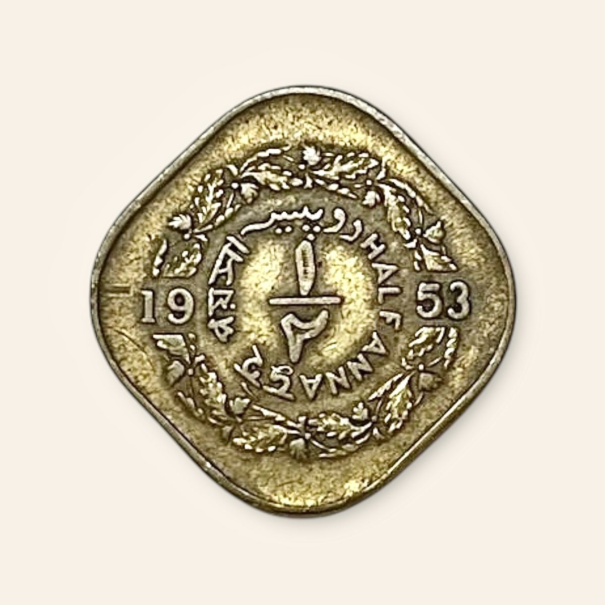 Pakistan Half Anna Coin minted in 1953 Featuring a Crescent Moon and star over a toughra Very Unique and rare