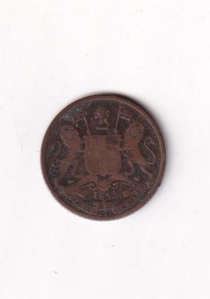 Ruler: Queen Victoria. The arms of the East India Company (2 lions, St George’s cross on the crest and flags, and the motto “AUSP: REG: & SEN: ANG:” (“Auspicio Regis et Senatus Angliæ”) on the ribbon) with date above the ribbon.