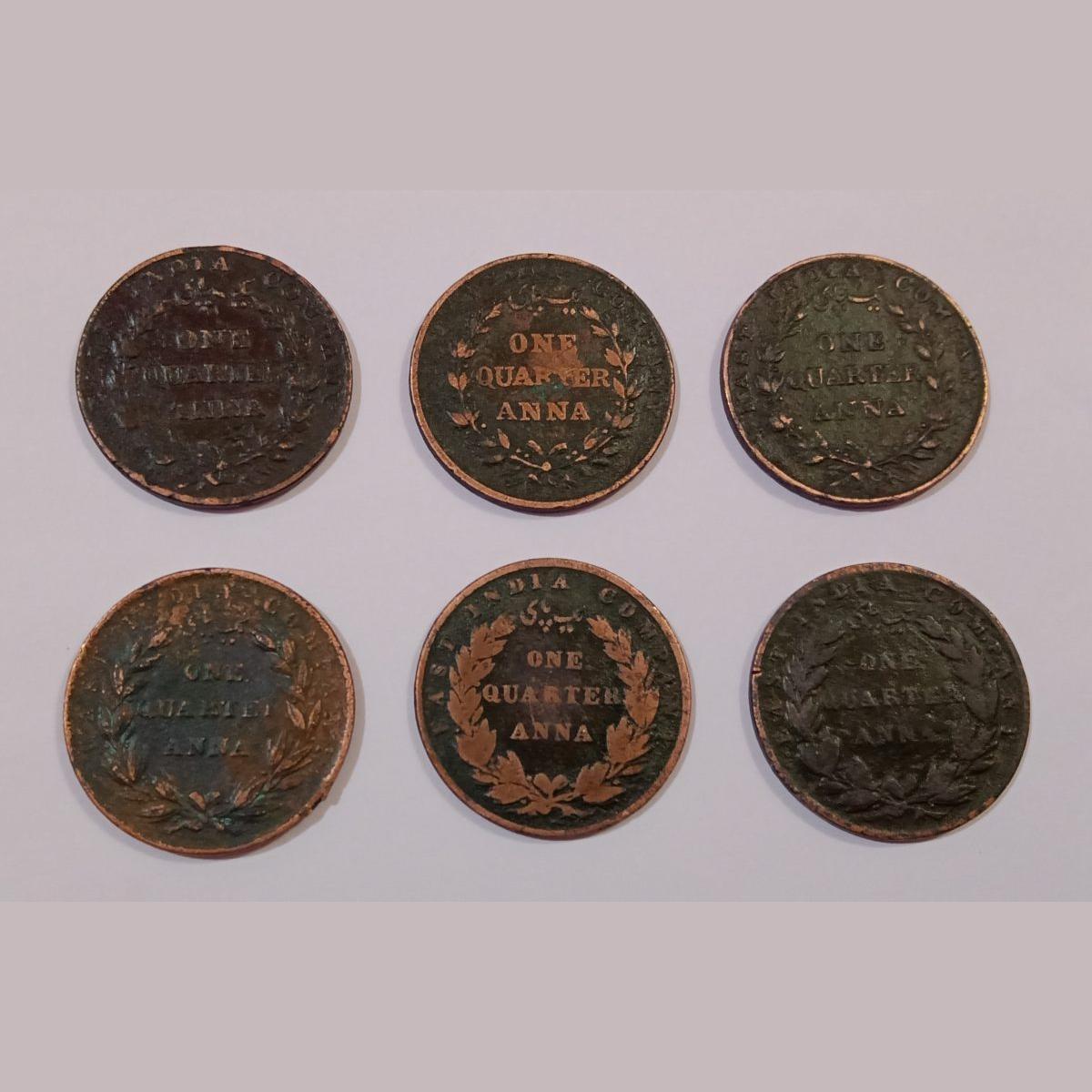 British India One Quarter Anna “EAST INDIA COMPANY” Year 1835 DIE VARIETY 3 SETS Total 6 Coins THICK AND THIN LEGENDS BALLOON VARIETY **VERY SCARE** Used Conditions.