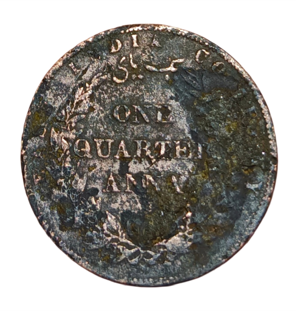 British India ONE QUARTER ANNA Key Date Year 1858 EAST INDIA COMPANY Inverted Axis Poor Grade.