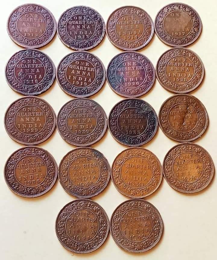 - BRITISH INDIA 🇮🇳 Copper 1/4aana 18 DIFFERENT YEARS SET GEORGE V. & Vl YEARS DETAILS 1912/13/14/17/18/19/20//28/29/30/33/34/36/38/39/40/41/42 EXCELLENT CONDITION..