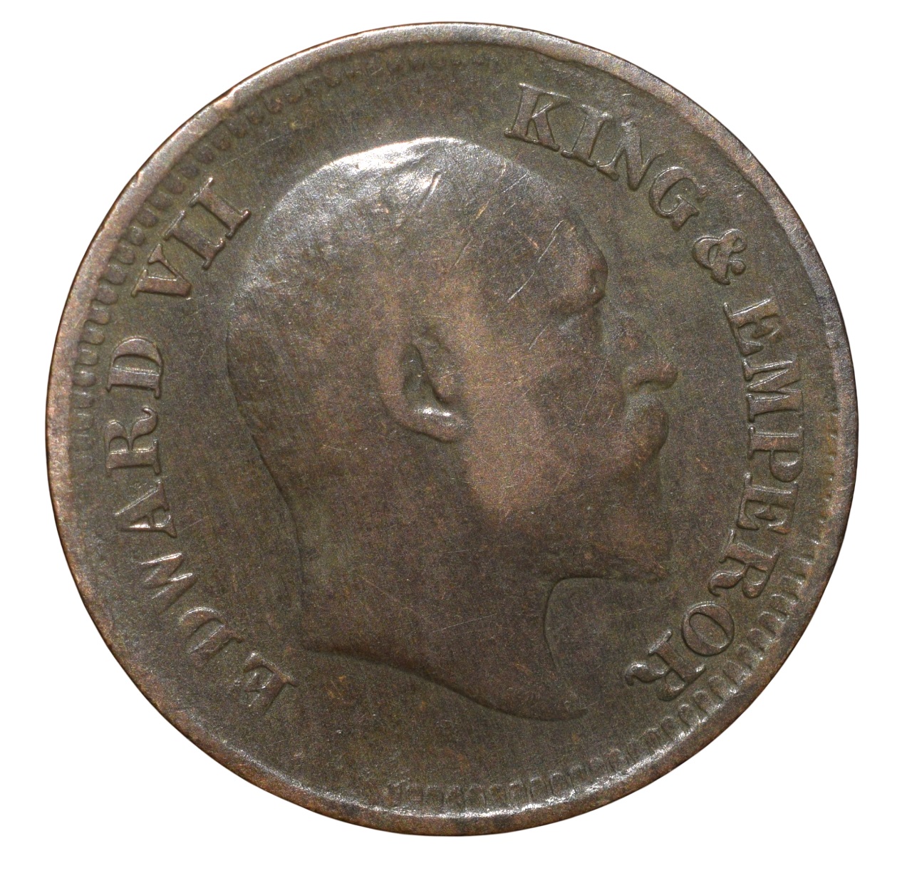Edward VII, (AD 1908), Bronze 1/2 Pice, Calcutta Mint, Obv: King Profile Bust facing Right, Inscriptions, Rev: Denomination & Date, 2.40 Gms, 21.18 mm, About Very Fine, Scarce.