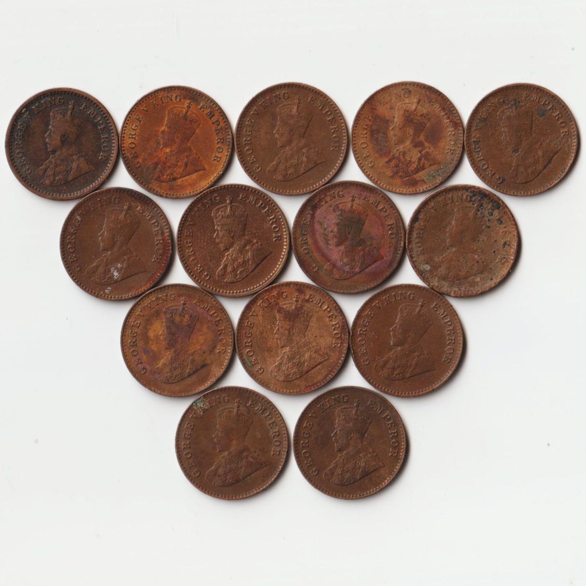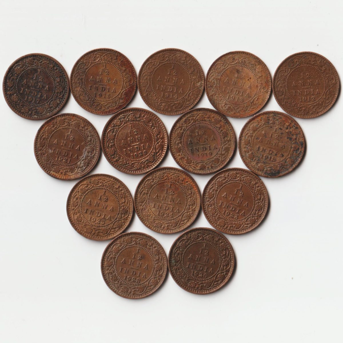 14 Coins Set of 1/12 Anna 1917 to 1928 Bronze Coins of King George V British India Coinage