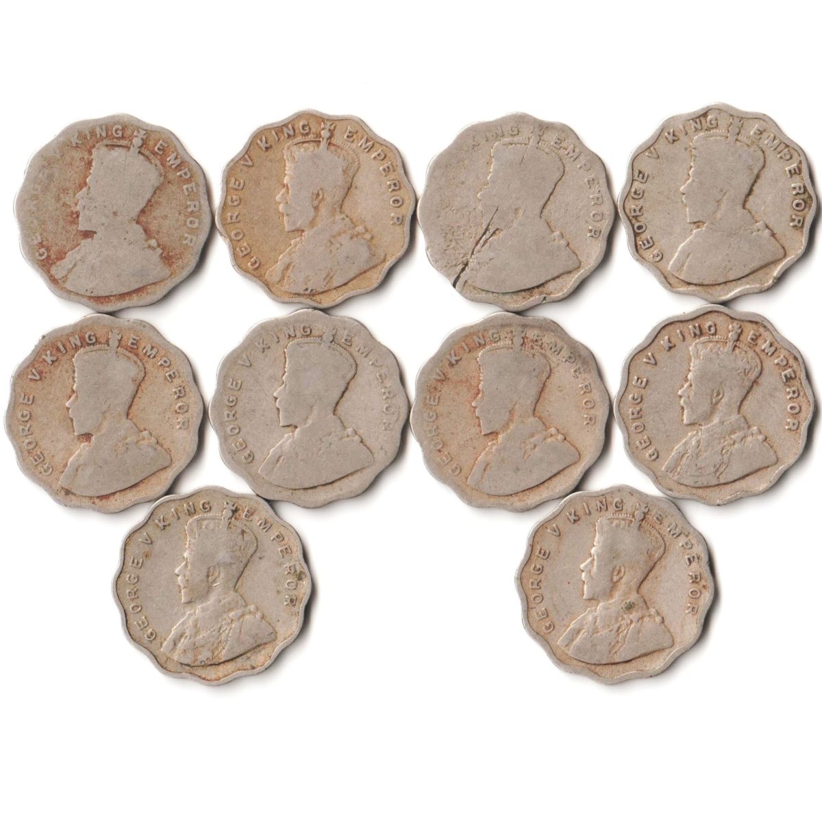 10 Coins Set of One Annas 1917-1936 Copper-Nickel Coin of King George V British India Coinage