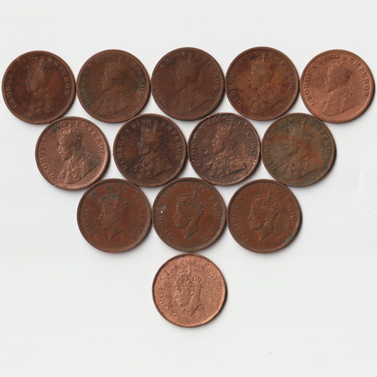 13 Coins Set of One Quarter Anna 1912 to 1942 Bronze Coin of King George V and George VI British India Coinage