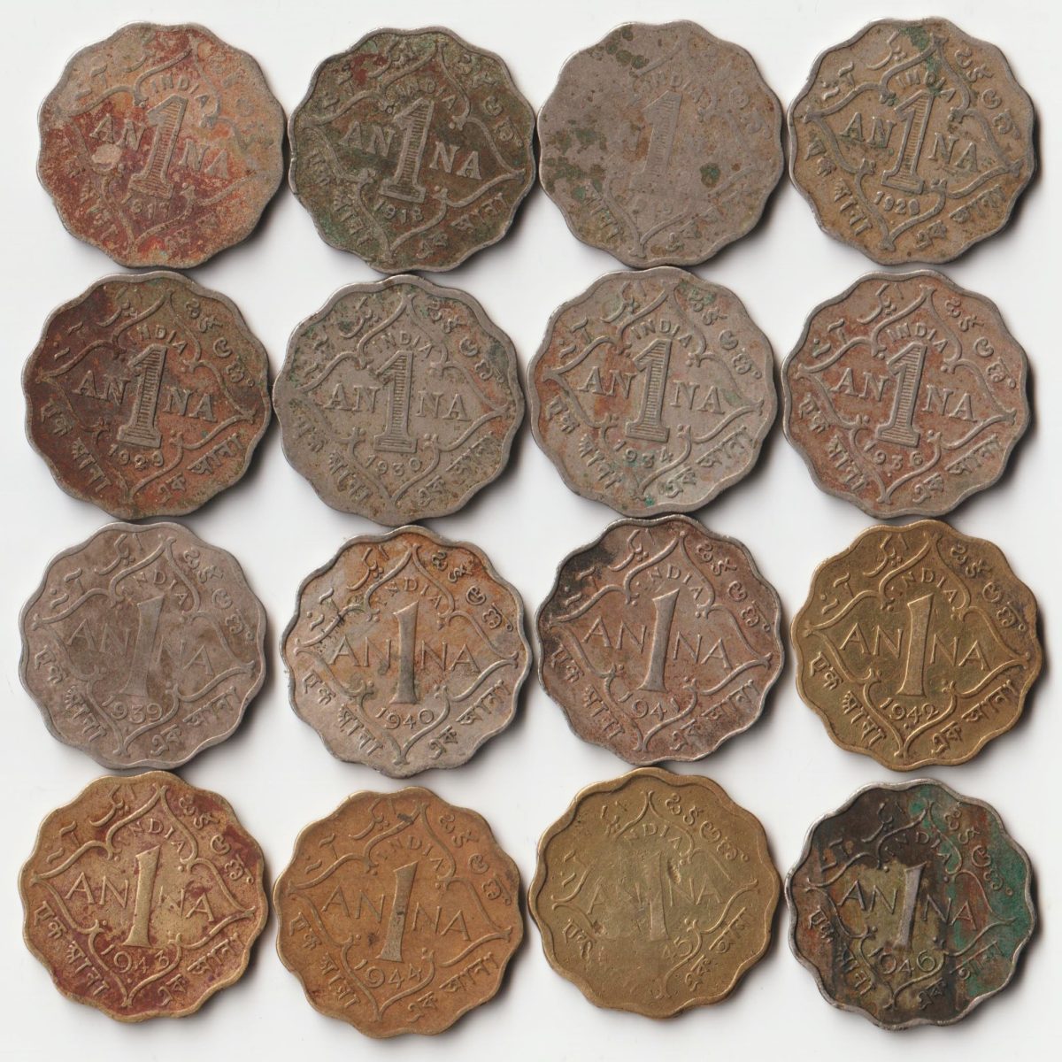 16 Coins Set of One Anna Different Dates and Different Mints Copper-Nickel Coins of King George VI and George V British India Coinage