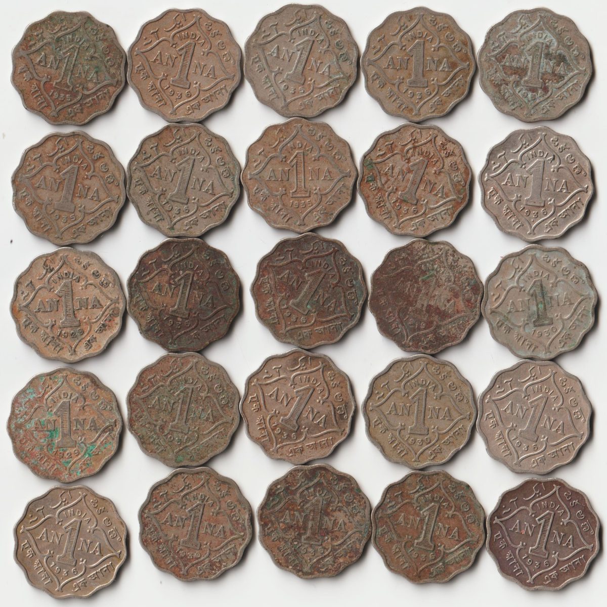 25 Coins Set of 1 Anna Different Dates and Different Mints Copper-Nickel Coins of King George V British India Coinage