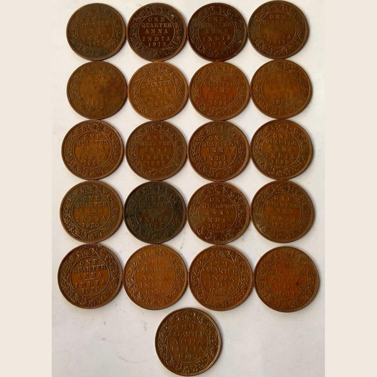 BRITISH INDIA 🇮🇳 Copper 1/4aana 21 DIFFERENT YEARS SET GEORGE V. & Vl YEARS DETAILS 1912/13/