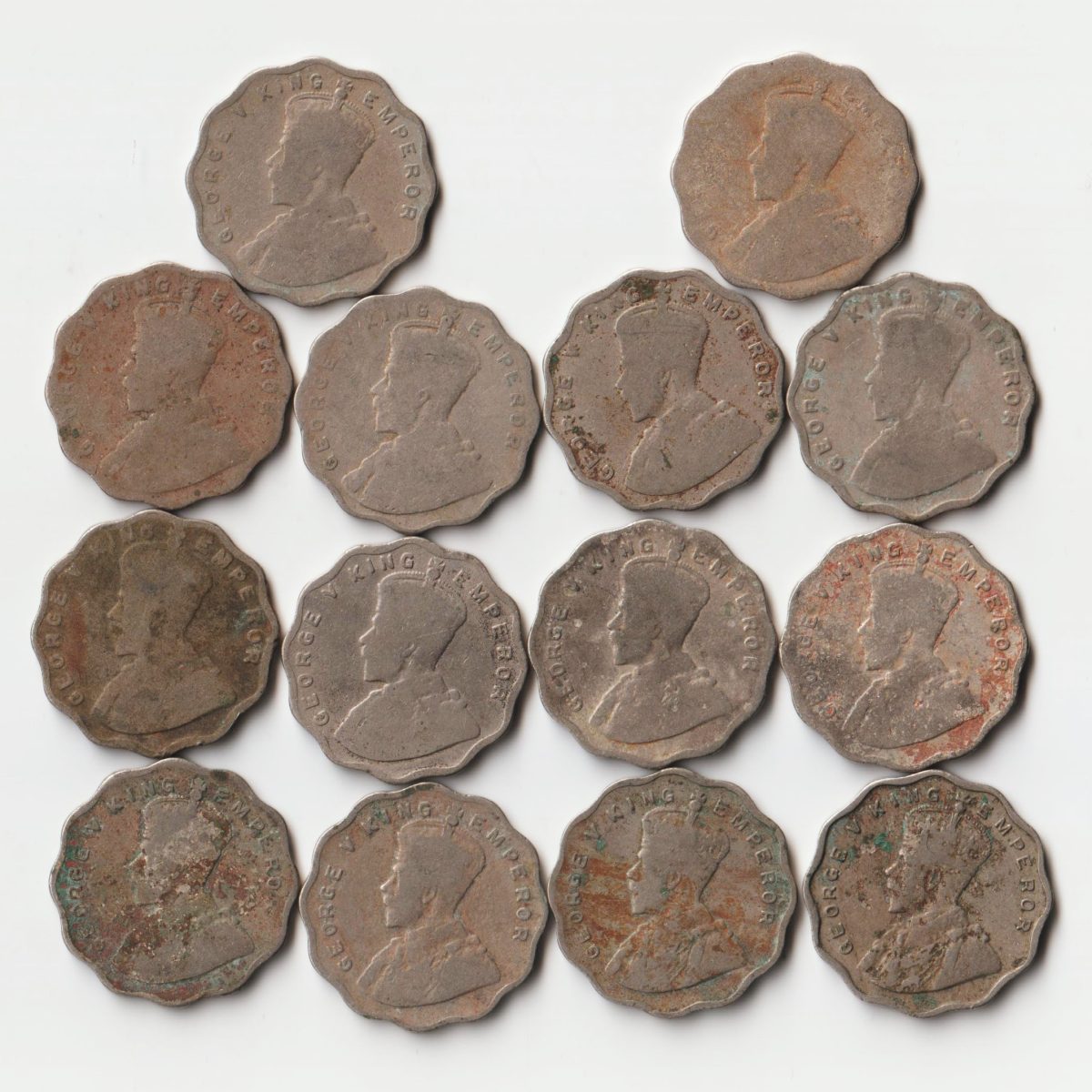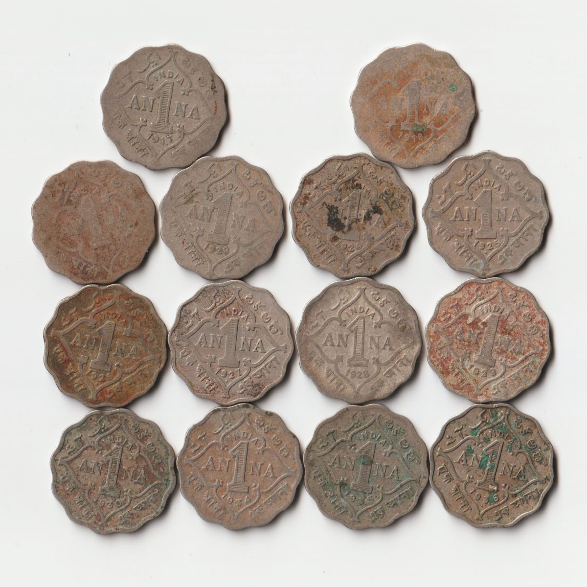 King George V Rare 14 Coins Set of One Anna 1917 to 1936 Different Mints Copper-Nickel Coins of British India Coinage