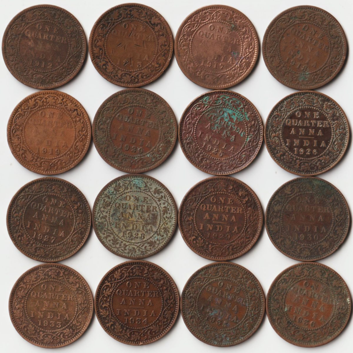 16 Coins Set of One Quarter Anna 1912 to 1936 Bronze Coin of King George V British India Coinage