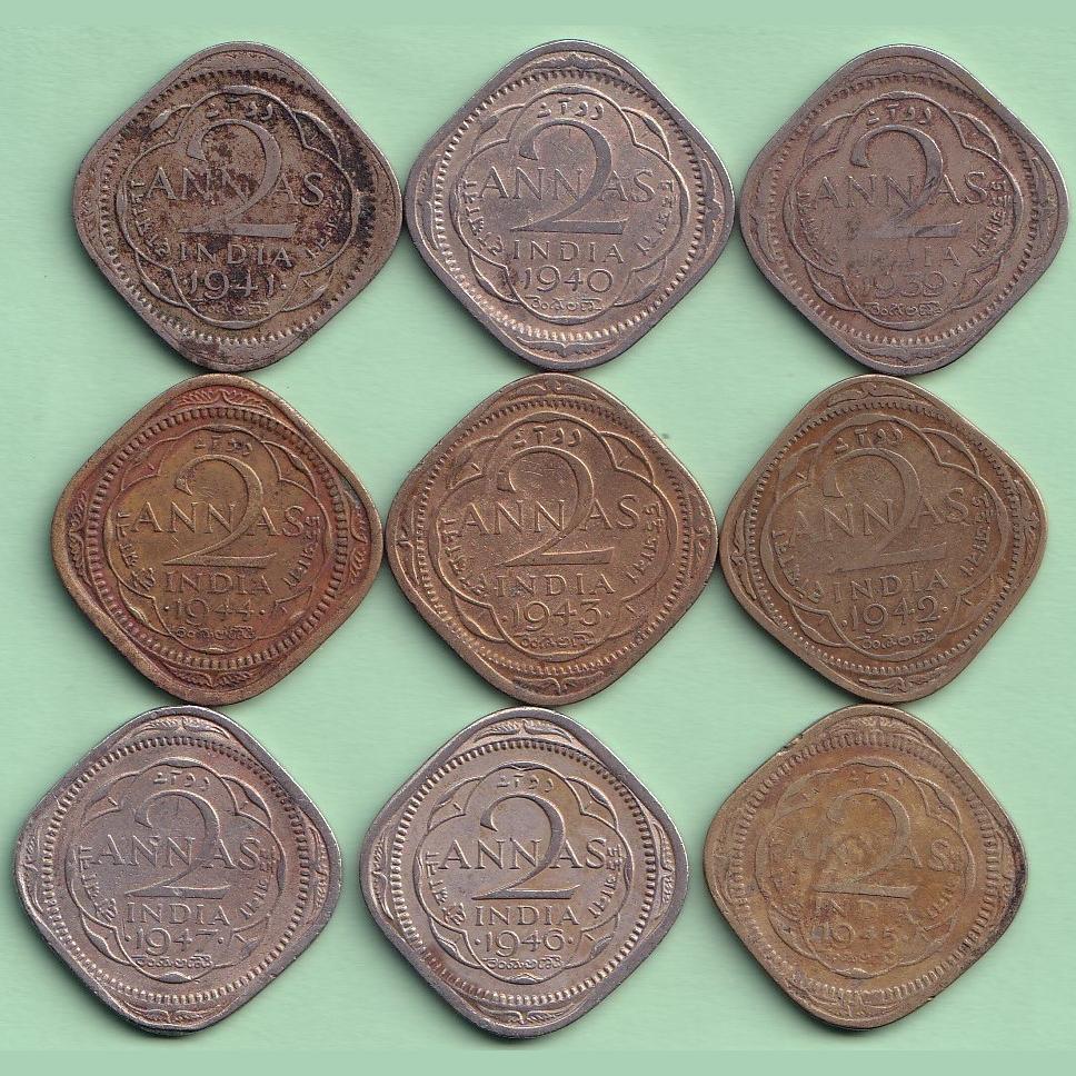 1939-1947 Complete Set Two Anna George Six British India Coin 9 Pcs Set
