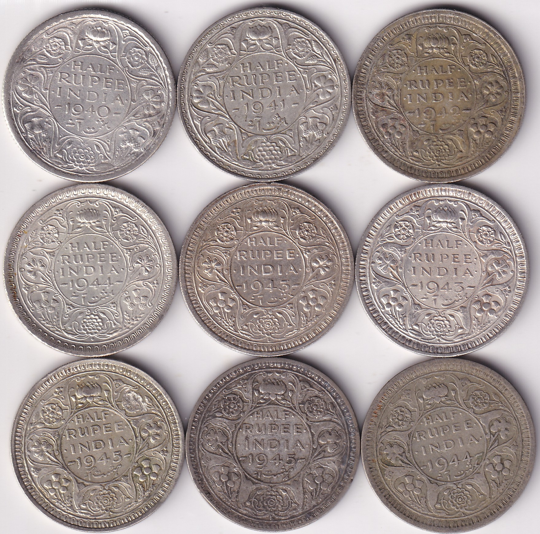 Half Rupee 1940,41,42,43,44,45 Bombay and Lahore Mint Complete Set Mint Wise Silver 9 Coins #2