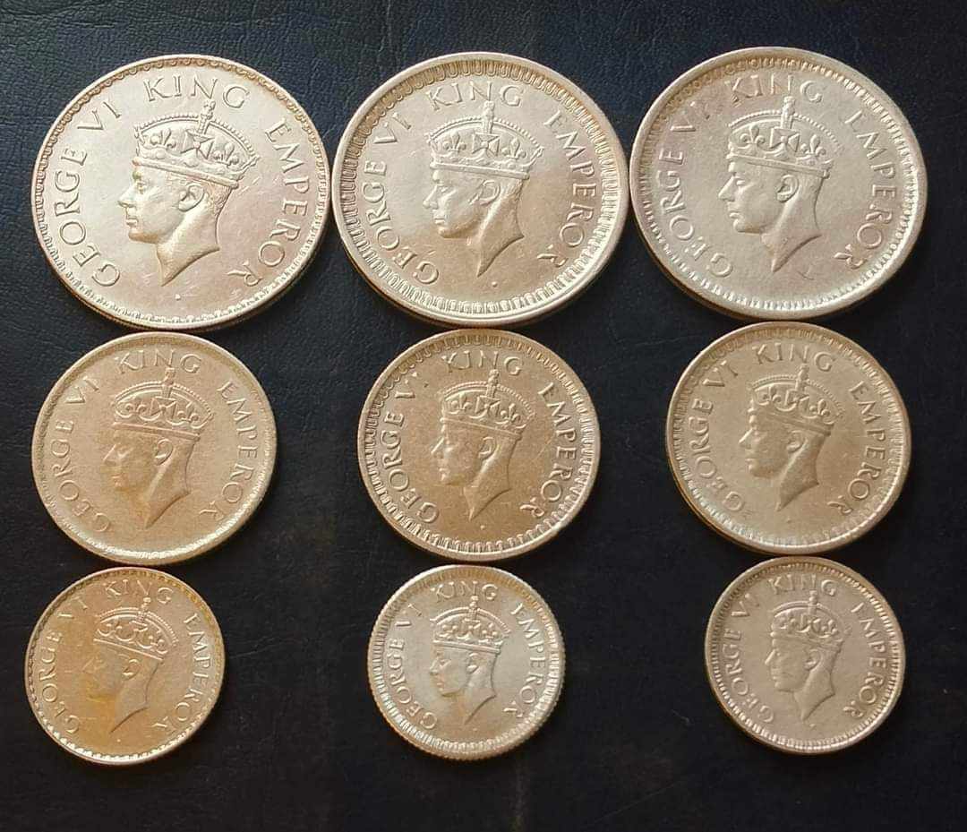 - Step back in time with this exquisite collectible set featuring KING👑👑 GEORGE VI coins from the years 1940, 1942, and 1944. This set includes ₹1, 1/2 half rupees, and 1/4 quarter rupees, each intricately designed and minted under the authority of the British Empire. Crafted from precious metals with varying weights of 11.5, 6, and 3 grams, these coins showcase the historical significance and craftsmanship of that era.