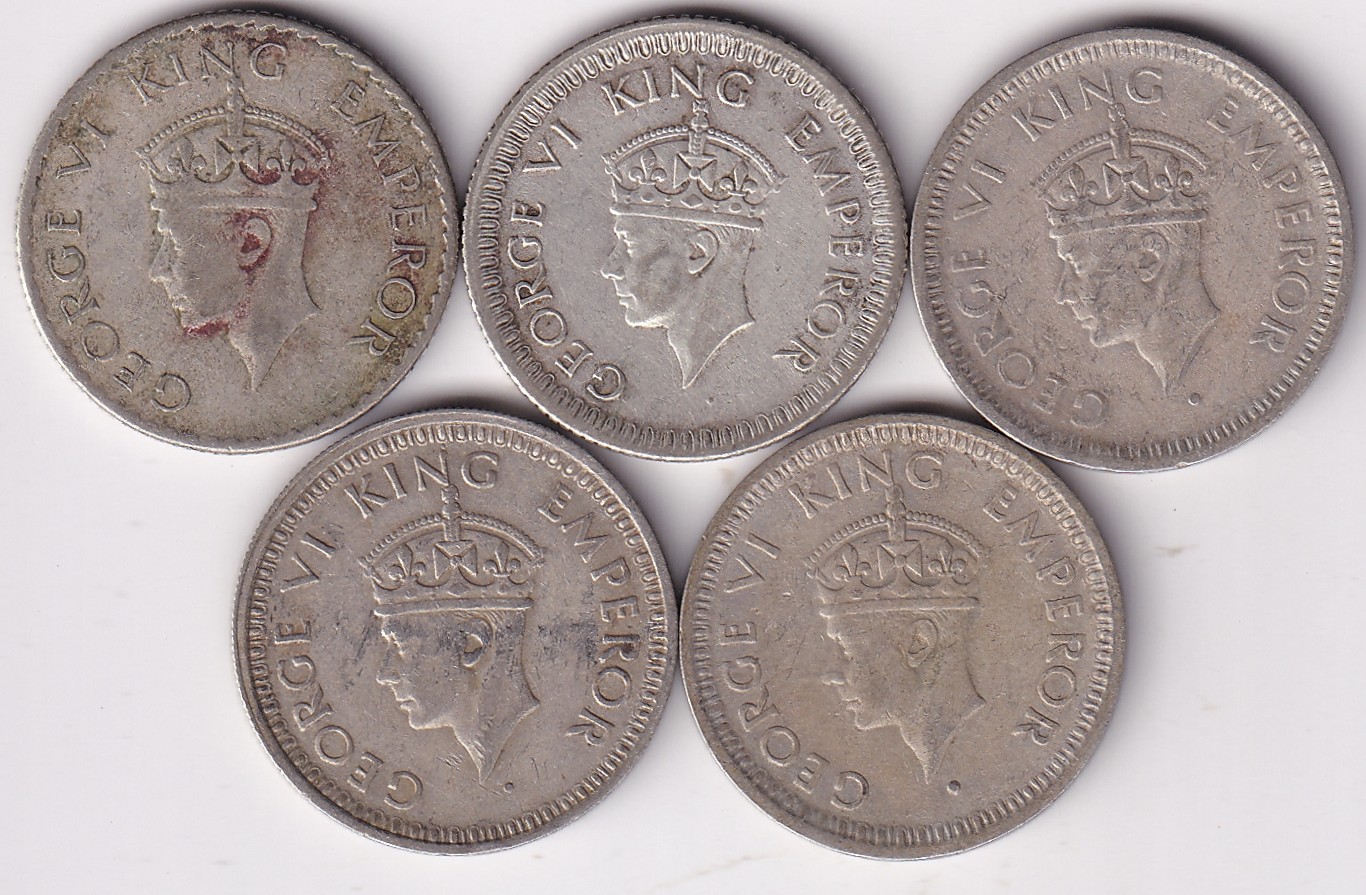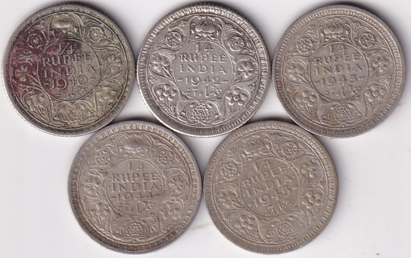 Quarter Rupee 1940,42,43,44,45 Five Silver Coins Set Rare #1