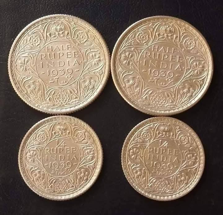 KING👑👑 GEORGE Vl 1939 date. Full silver coins BOMBAY MINT & Calcutta mint 1/2 half rupees & 1/4 quarter rupees set WEIGHT 6 GM & 3 gm EXCELLENT CONDITION. Same and similar piece available