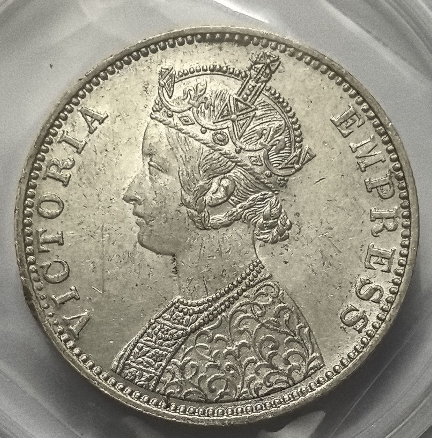 Victoria, the reigning monarch during this period, lends her regal presence to this coin, making it a coveted item among collectors and enthusiasts alike. The intricate design reflects the artistry of the time and serves as a tangible link to the colonial past of India. Its pristine condition and historical significance make it a valuable addition to any collection, offering a glimpse into the bygone days of the British Raj.