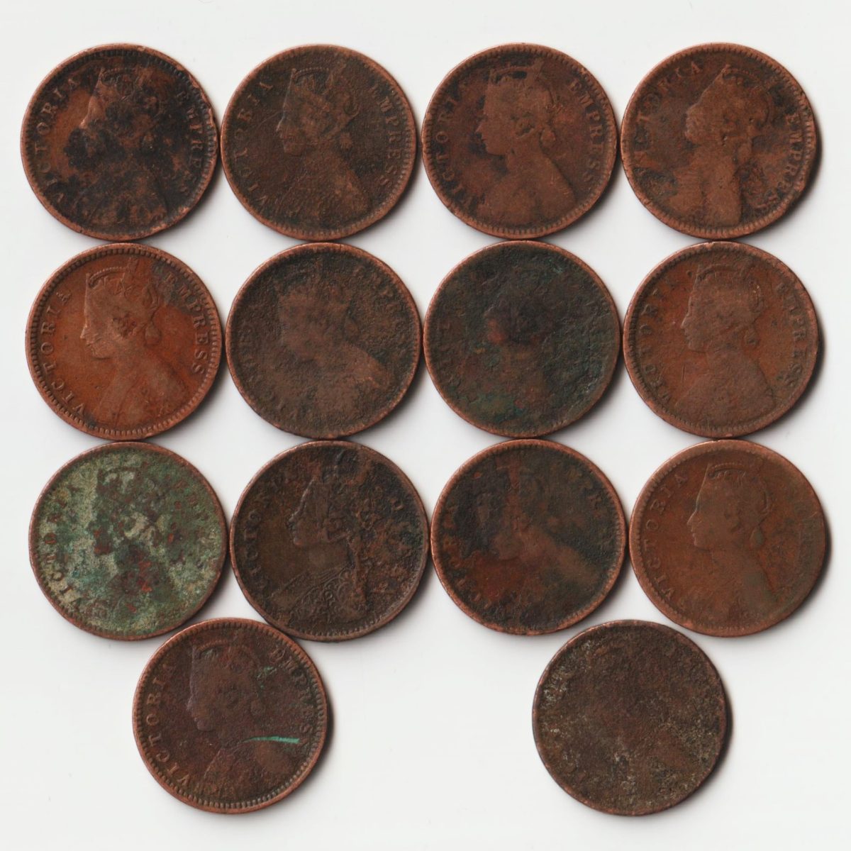 Rare 14 Coins Set of 1/12 Anna 1885 to 1901 Copper Coins of Victoria Queen British India Coinage
