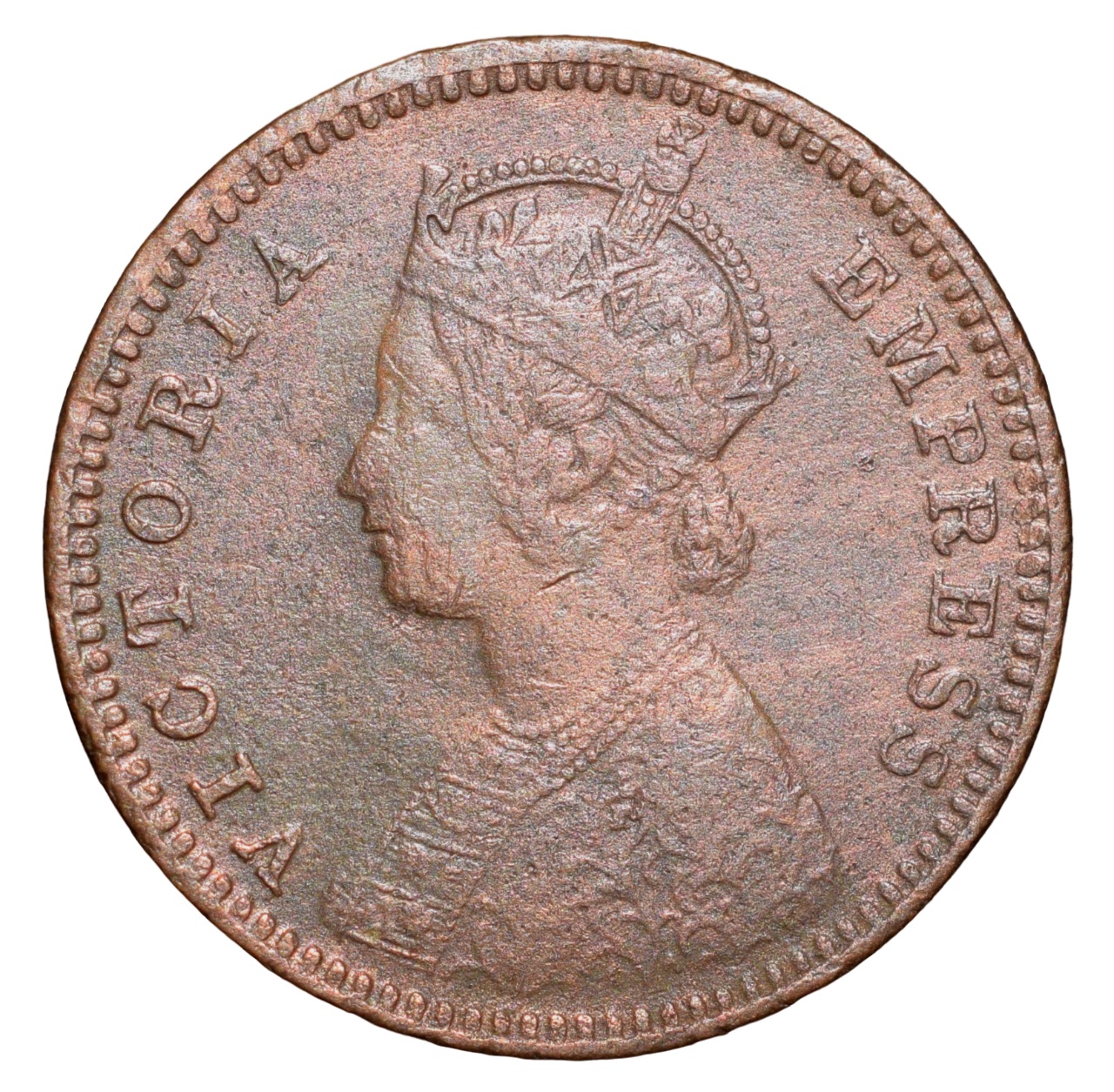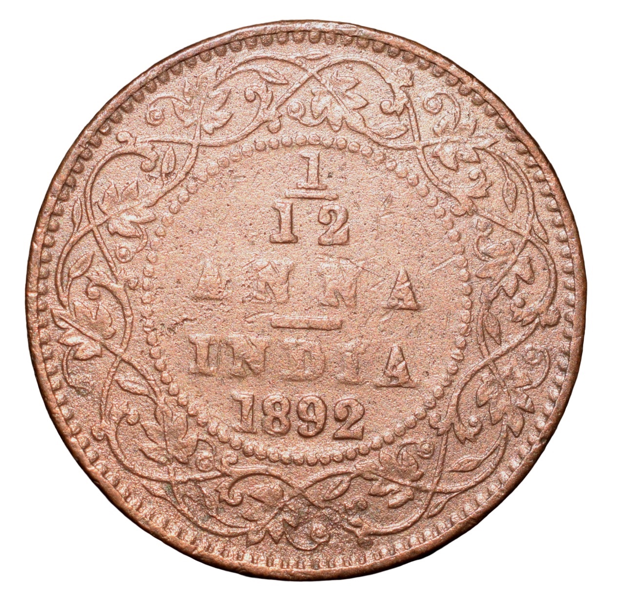 Victoria Empress, (AD 1892), Copper 1/12 Anna, Calcutta Mint, Bust Type B, Inverted small ‘V’ at the bottom center of the bust, 2.24 Gms, 15.82 mm, (KM# 483) Abou fine, Scarce.