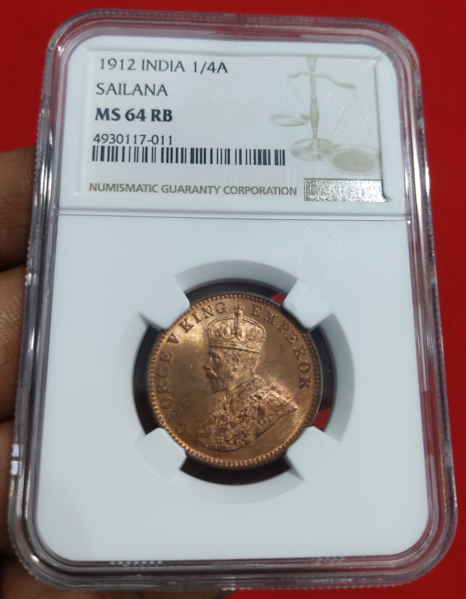 RARE SAILANA STATE ONE QUARTER ANNA 1912 GEORGE V KING NGC GRADED MS 64