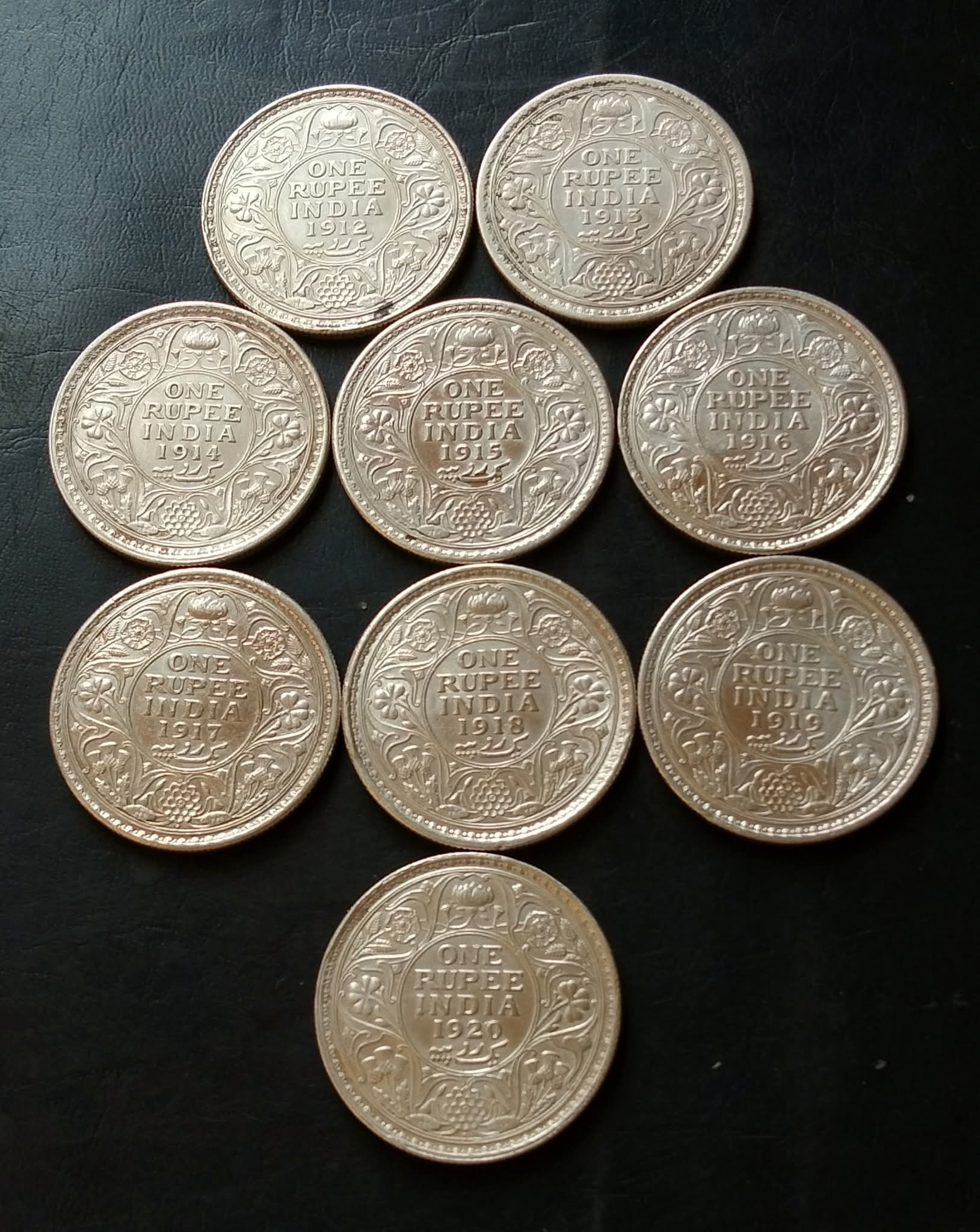 SILVER BRITISH INDIA 🇮🇳 DIFFERENT YEARS COLLECTION KING👑👑👑👑 GEORGE V FULL SILVER 9 DIFFERENT YEARS 1₹SET WEIGHT 11.6GM EACH 1912/13/14/15/16/17/18/19/20 ORIGINAL GAUARANTEE EXCELLENT CONDITION. Same and similar piece available