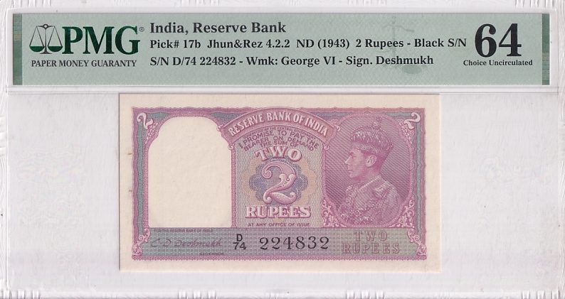 British india 2 Rupees king geroge VI Unc 64 PMG Gradaed Note #1