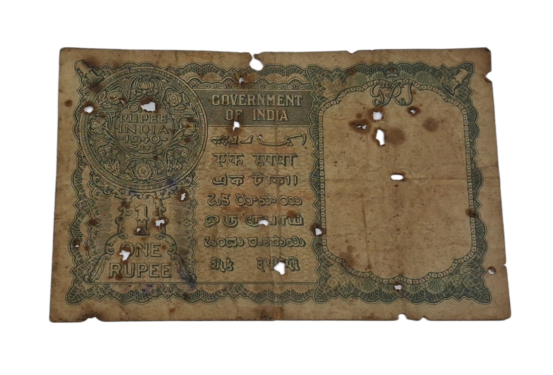 British India ONE RUPEE Year 1940 “BURMA OVERPRINT” Sign C. JONES King GEORGE-VI Green Serial **V. SCARE** Used Condition.