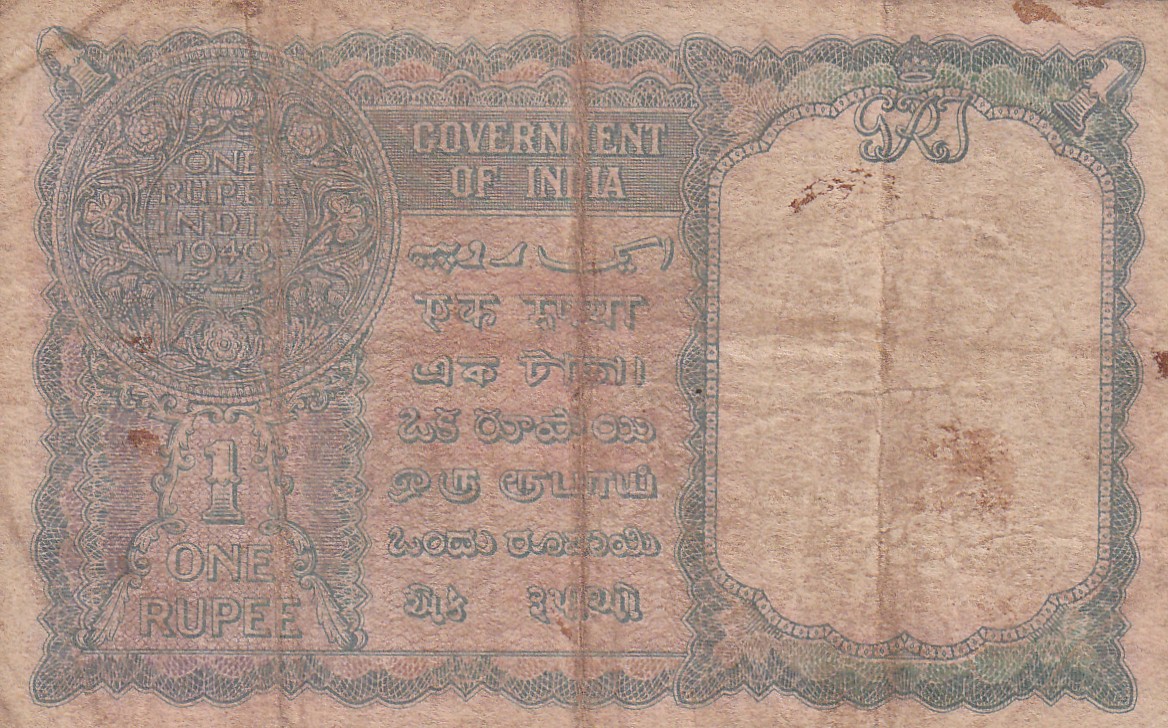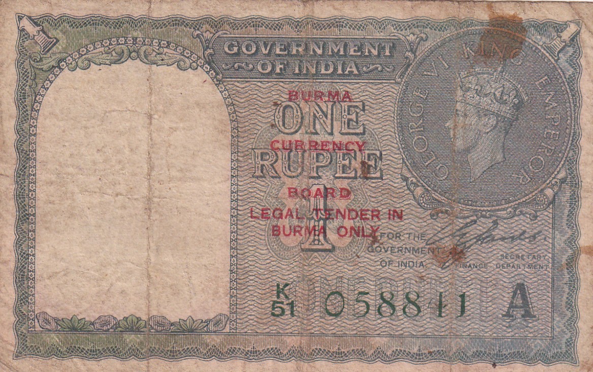 British India One Rupees 1940 (Burma) Extremely Rare Note
