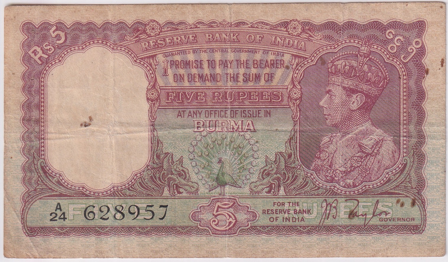 Burma King George VI 5 Rupees Very Fine Detail Very Rare Note #2