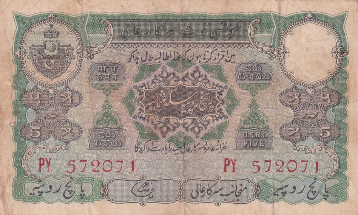 🔍 Rare Hyderabad Princely State 5 Rupees Note