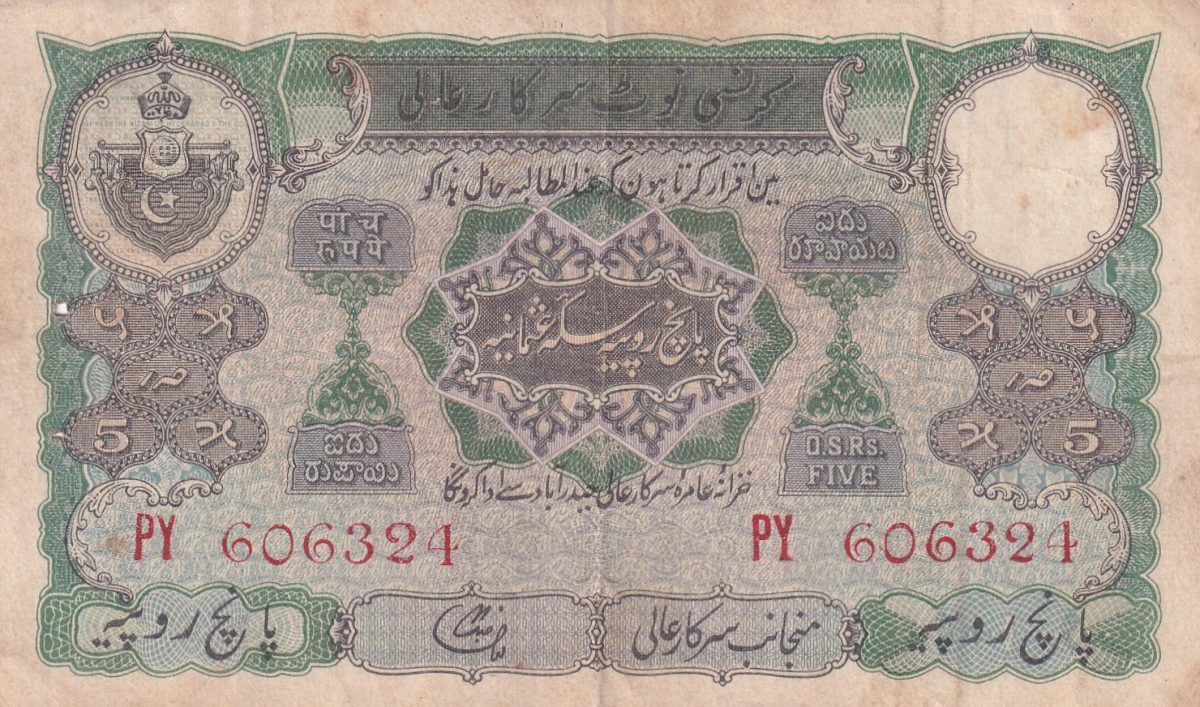 🔍 Rare Hyderabad Princely State 5 Rupees note