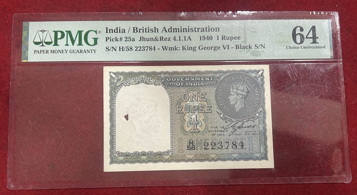 Step back in time with this exquisite ONE RUPEE 1940 banknote from British India featuring the portrait of King George VI. Graded by PMG as 64, this historical piece holds significant numismatic value. Issued during a pivotal period in Indian history, this note represents the British colonial era and showcases intricate design elements reflective of the time. The crispness of the note, coupled with its rarity and historical significance, makes it a prized possession for collectors and enthusiasts alike. This collectible item comes with a unique blend of authenticity, historical relevance, and aesthetic appeal, making it a must-have for any serious collector. Whether you’re a seasoned numismatist or a history buff, this note offers a tangible connection to the past, making it a valuable addition to any collection.