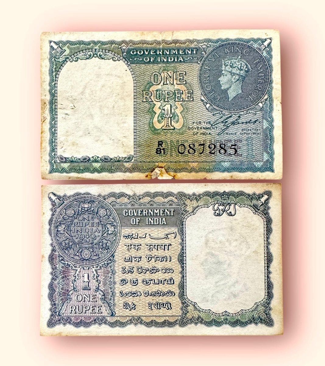 - Re 1 British India Banknote 1940 Black Series King George VI Collectible Quality 087285 Burma Issue Unique and Rare Issue