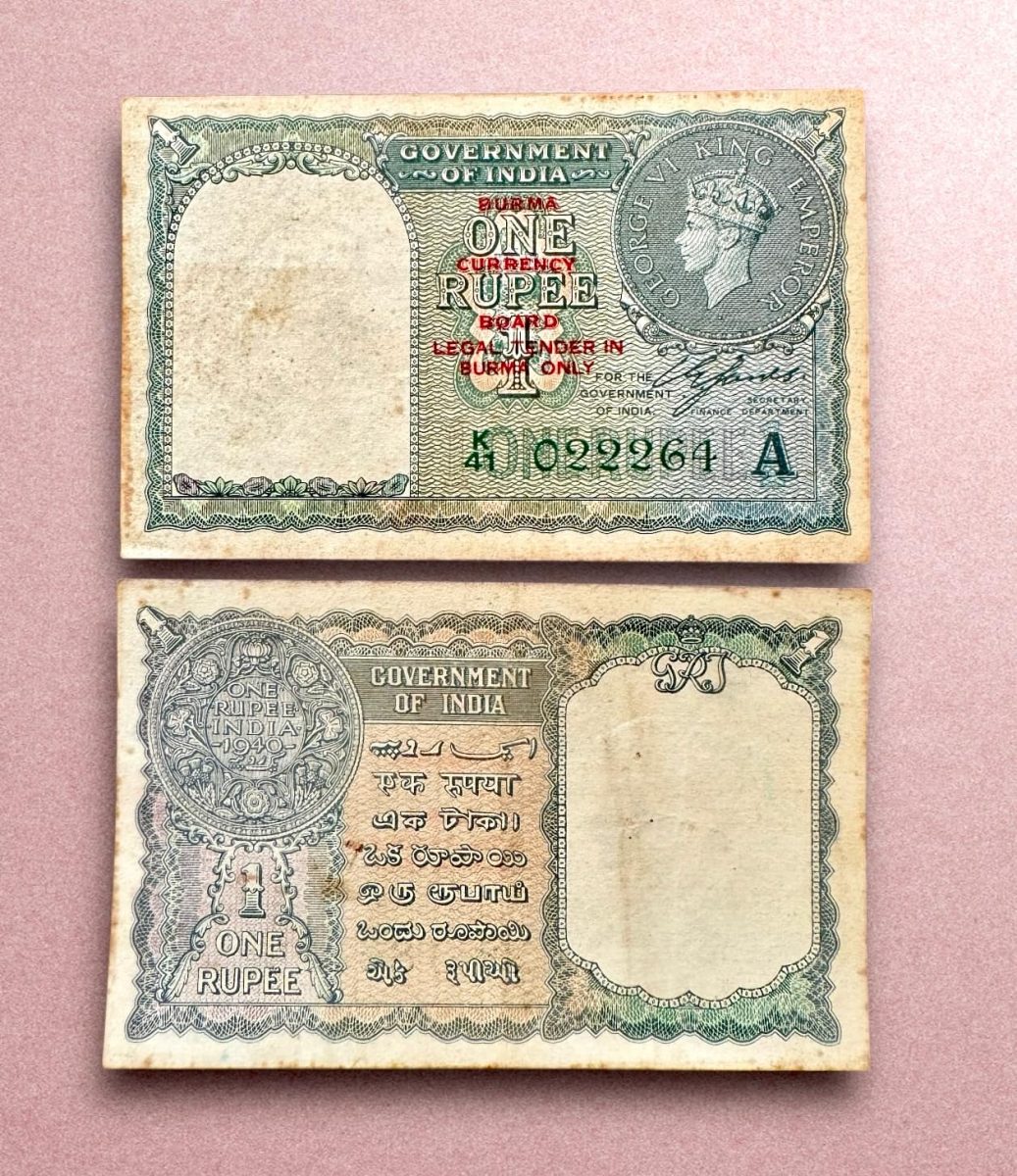 Re 1 British India Banknote 1940 Black Series King George VI Collectible Quality 022264 Burma overprint Unique and Rare Issue