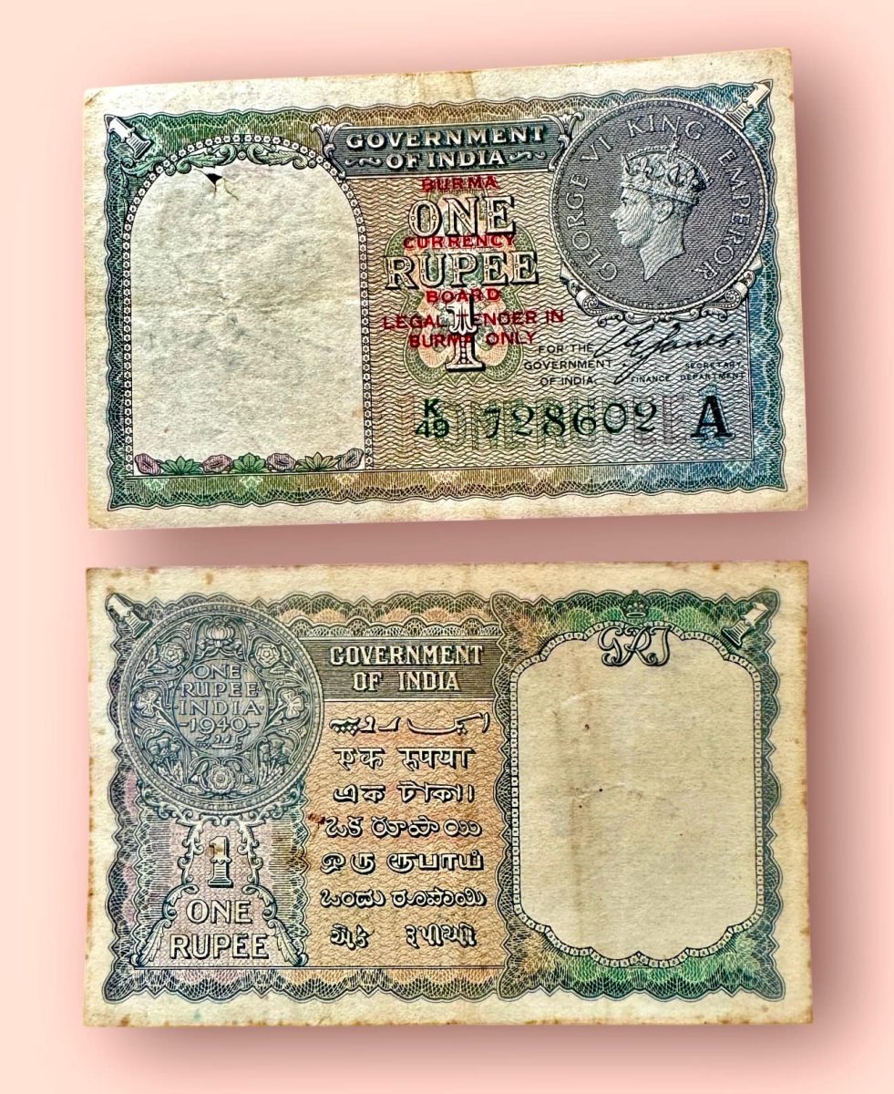 Re 1 British India Banknote 1940 Black Series King George VI Collectible Quality 728602 Burma overprint Unique and Rare Issue
