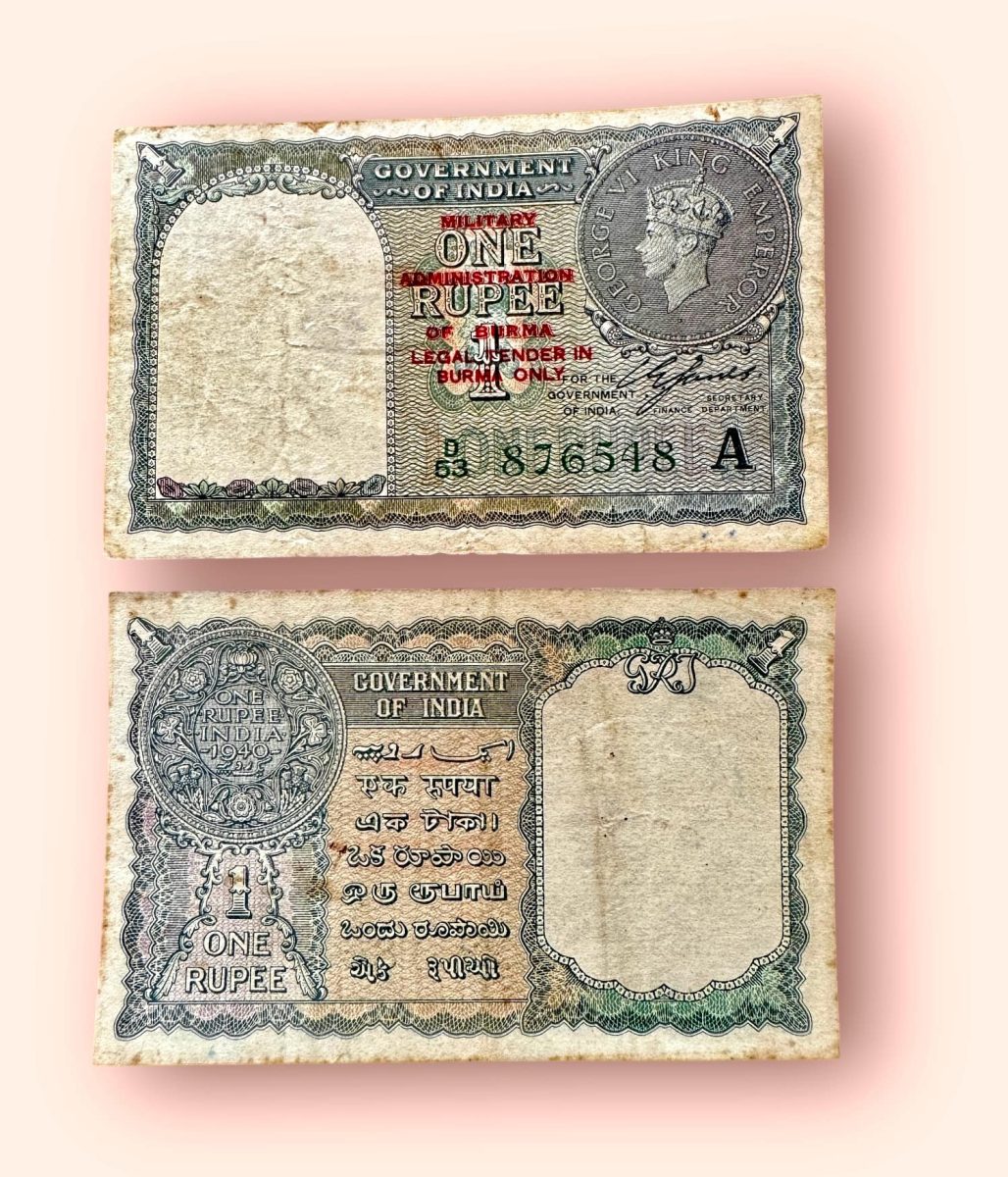Re 1 British India Banknote 1940 Black Series King George VI Collectible Quality 876548 Burma overprint Unique and Rare Issue