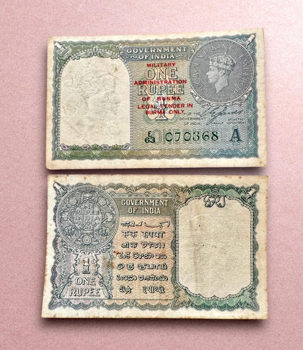 Re 1 British India Banknote 1940 Series Black Series King George VI Collectible Quality 070368 Burma Issue Unique and Rare