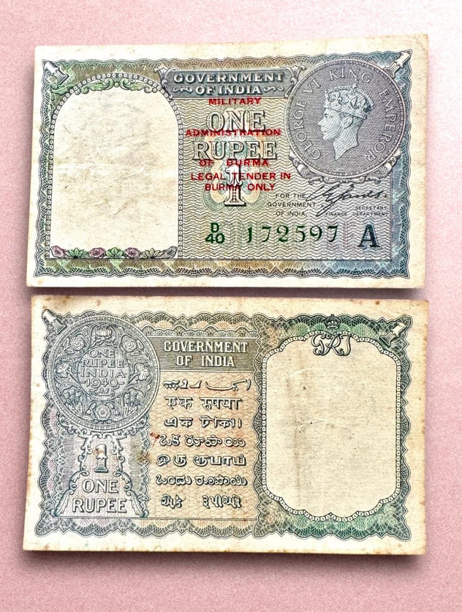 Re 1 British India Banknote 1940 Series Black Series King George VI Collectible Quality 172597 Burma Issue Unique and Rare Issue )