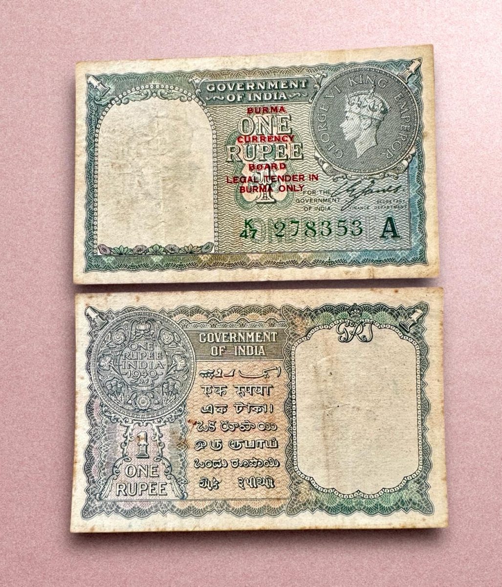 Re 1 British India Banknote 1940 Series Black Series King George VI Collectible Quality 278353 Burma Issue Unique and Rare Issue