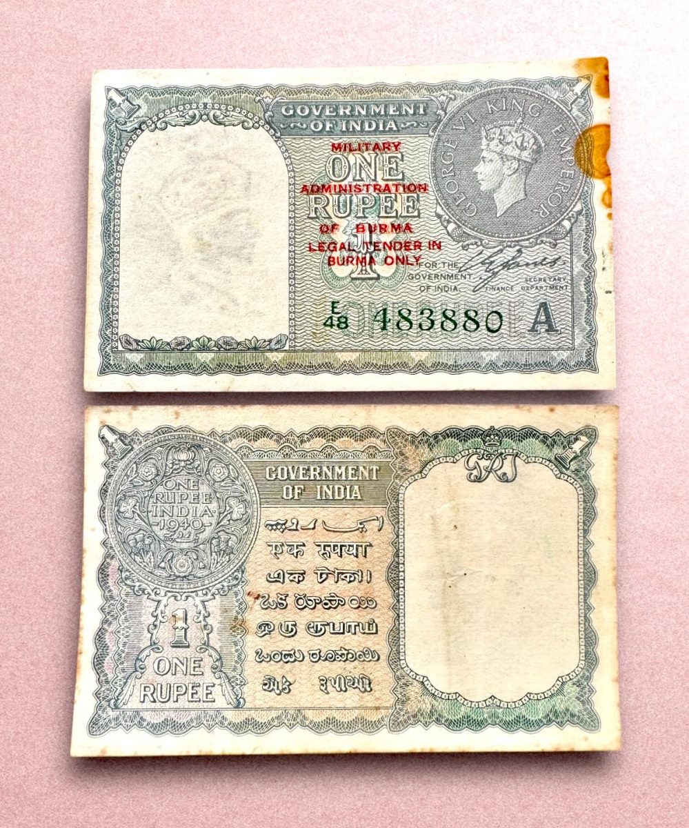 Re 1 British India Banknote 1940 Series Black Series King George VI Collectible Quality 483880 Burma Issue Unique and Rare Issue