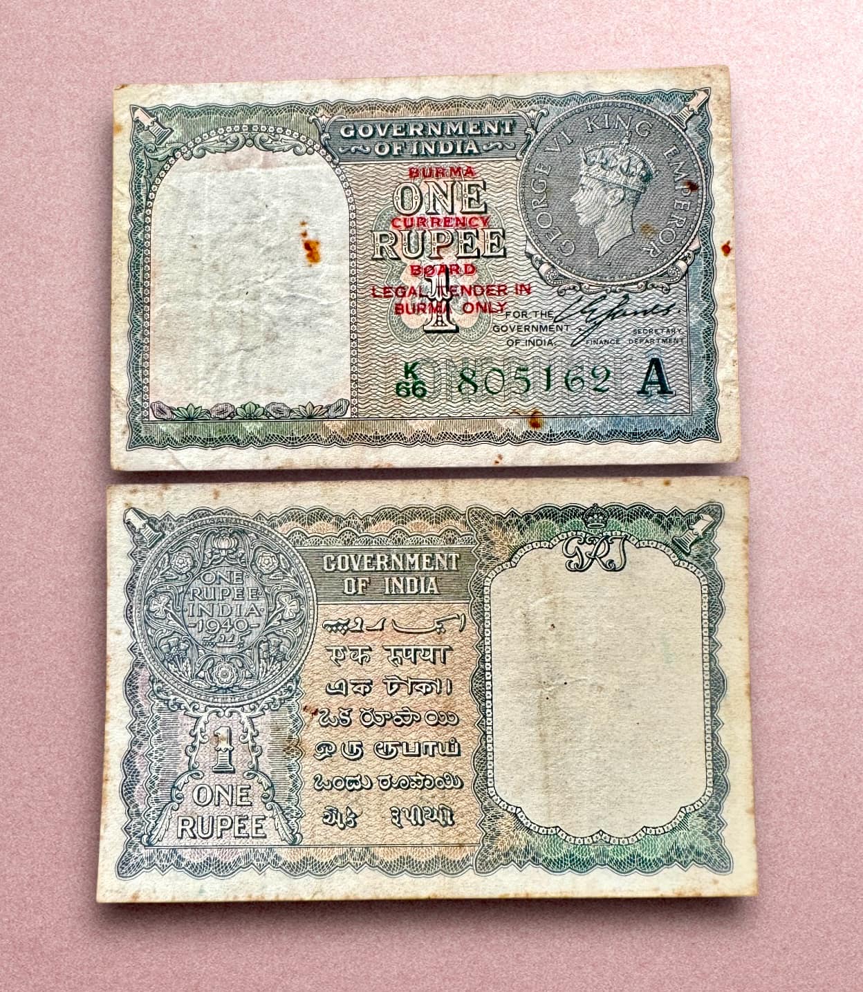 Re 1 British India Banknote 1940 Series Black Series King George VI Collectible Quality 805162 Burma Issue Unique and Rare Issue